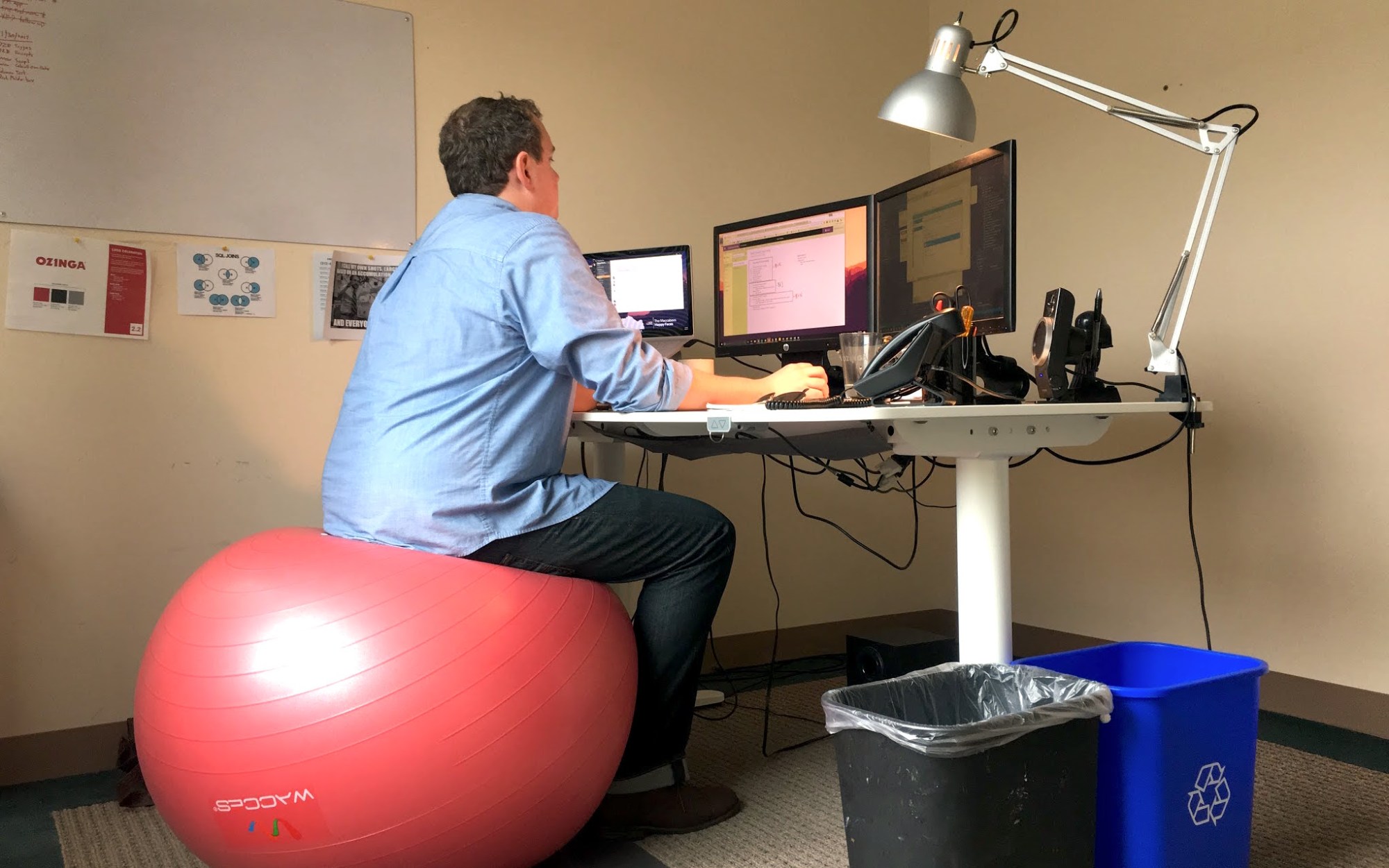 When I started here in 2011 I was given the standard Herman Miller chair that’s all throughout corporate America. Don’t get me wrong, it’s a great chair. There’s a reason it’s the staple in both startups and giant corporations alike. But it didn’t help me transition from the active college student to the corporate desk jockey as well as I liked. I was constantly sore and stiff throughout the day and my back and joints felt like I was 52, not 22. It turns out sitting for 9+ hours plus commuting in the car for another hour or two isn’t great for you. So I swapped out the expensive Herman-Miller chair for a $30 exercise ball.